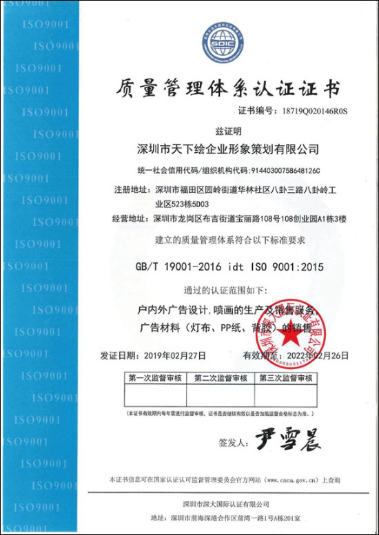 深圳市亞日企業形象策劃有限公司成立于2004年,總部位于深圳龍崗區(qū),在北(běi)京、長(cháng)沙、鄭州、常州、廣州、深圳等地擁有6大(dà)生産基地,在廣西區(qū)、江蘇省、廣東省、海南(nán)省、浙江省、安徽省、河(hé)南(nán)省、福建省等省份擁有近多(duō)個(gè)項目辦事處,擁有70餘台進口戶内、戶外噴繪寫真機器及大(dà)型5米UV設備的(de)生産企業,日産能過萬平方米,公司是集廣告策劃、設計、制作、安裝、發布推廣爲一體,具備标準規模化(huà)綜合性的(de)廣告公司。公司秉承以科學的(de)工藝流程、精湛的(de)工匠(jiàng)技藝、嚴謹的(de)工作态度、親切的(de)服務和(hé)優質的(de)産品, 應對(duì)客戶的(de)每一項細微要求,我們的(de)宗旨是“全面化(huà)、品牌化(huà)、專業化(huà)”。